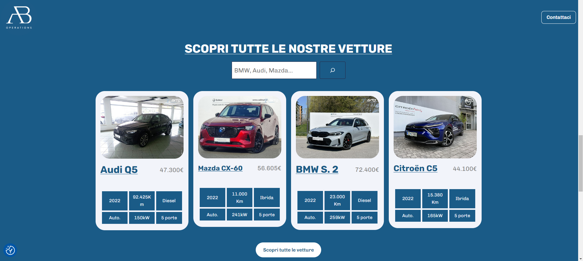 Il nostro studio grafico ha realizzato il sito di AB OPERATION. Potete visitare il sito web tramite le foto esposte qui sotto. L’obbiettivo del sito è vendere automobili di seconda mano.